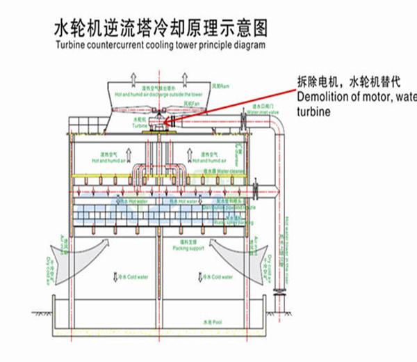 2)改造后:水力驱动风机型冷却塔原理示意图